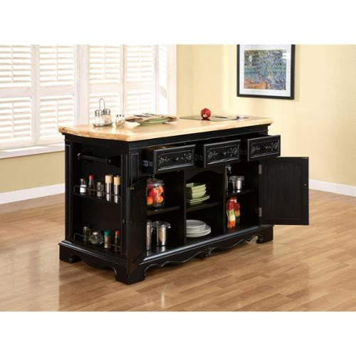 Powell Color Story Black Butcher Block Kitchen Island. $ 664.92 $ 492.53. A stunning contrast of black and natural wood creates a highly sophisticated, chic look for the Color Story Antique Black Butcher Block Kitchen Island. Black finished legs are topped with a durable, butcher block top that's the ideal surface for preparing foods.