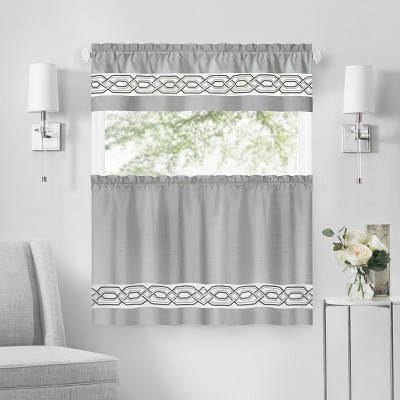 Dana Kitchen Curtain Set, Decorative Faux Silk 3pc Rod Pocket Valance & Panels with Geometric Embroidery Design in White/Silver, BLACK